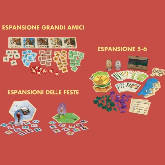 Espansione per 5–6 giocatori: 11 esagoni di terreno, 4 parti di cornice, 28 gettoni numerati, 2 schede dei costi di costruzione, 25 carte materie prime, 9 carte sviluppo, 48 pedine, 2 scatole per pedine, 2 sagome con basette