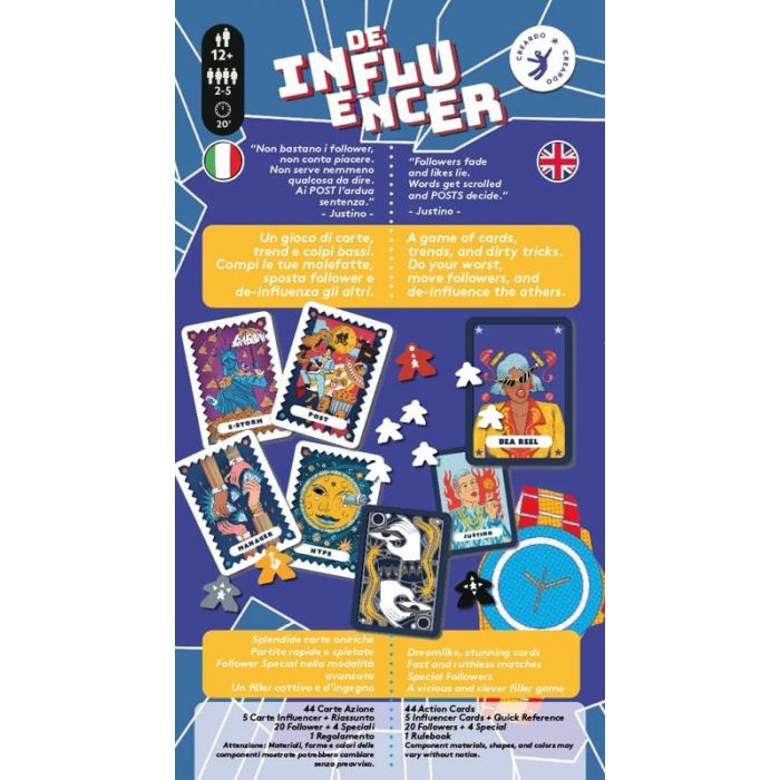De Influencer è un gioco di carte satirico e competitivo che trasporta i giocatori nell’arena digitale dei social network, dove i follower sono la vera valuta e ogni trend può decretare il successo o la caduta. Ogni partecipante veste i panni di un influencer in ascesa, pronto a manipolare i trend, conquistare follower e ostacolare gli avversari con carte azione imprevedibili. Grazie a personaggi speciali e due modalità di gioco, l’esperienza è sempre varia e ricca di ironia pungente sul mondo dei social. Con regole semplici ma strategiche, turni rapidi e alta interazione, De Influencer è un filler game adatto a tutti, capace di garantire rigiocabilità e divertimento in ogni partita.
