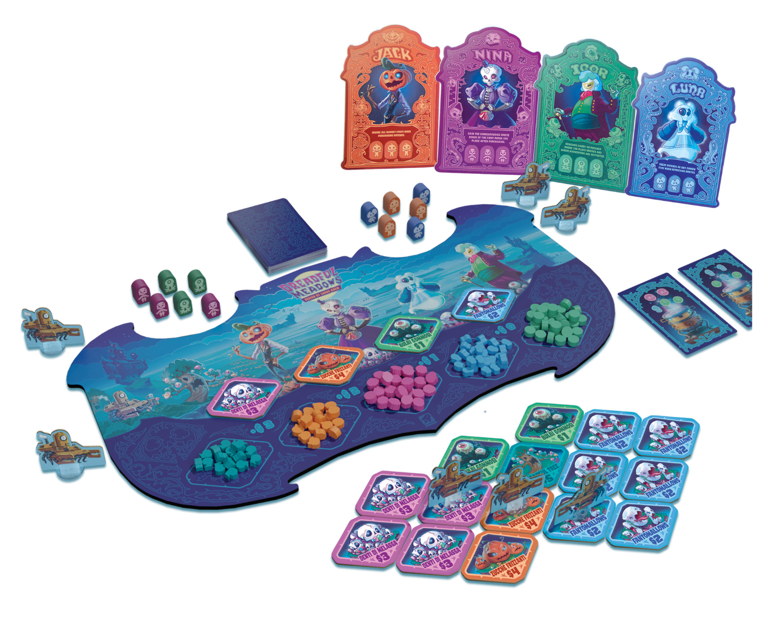 Dreadful Meadows è il nuovo gioco da tavolo in edizione italiana che unisce dolcezza e mistero in un’ambientazione unica. I giocatori vestono i panni di pasticceri stregati intenti a coltivare campi infestati, raccogliere caramelle magiche e creare impasti arcani per conquistare il titolo di Pasticcere più temuto del regno.