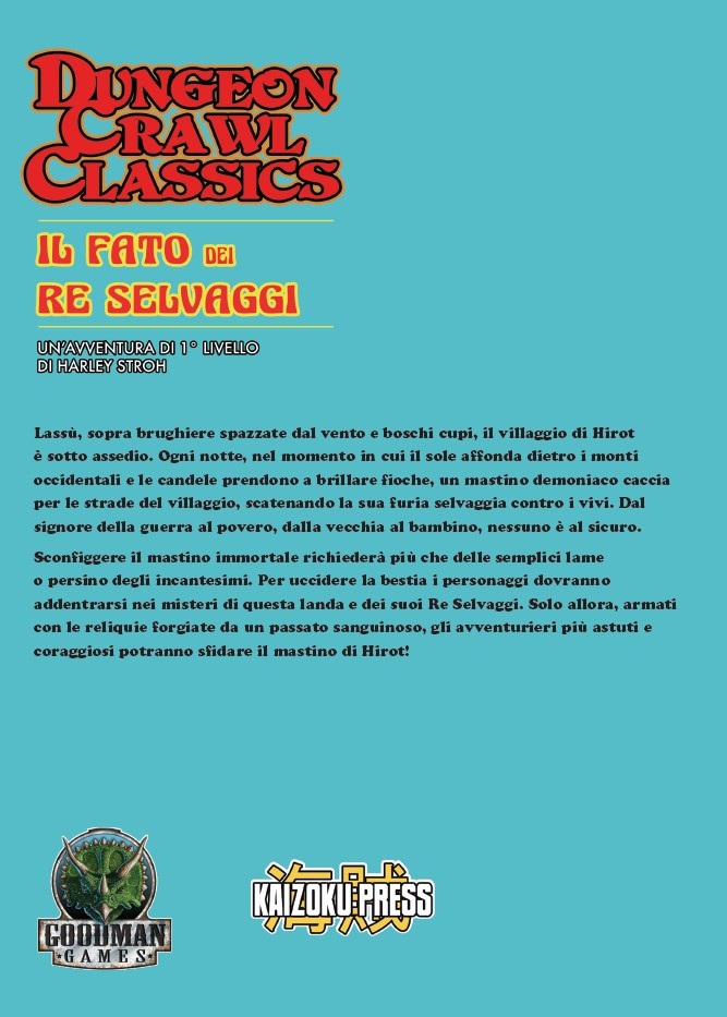 Il Fato dei Re Selvaggi è un’avventura per Dungeon Crawl Classics, il celebre gioco di ruolo Old School. Pensata per 6-12 personaggi di 1° livello, porta i giocatori nel villaggio di Hirot, un luogo cupo e tormentato da un mastino demoniaco che ogni notte semina terrore tra gli abitanti.