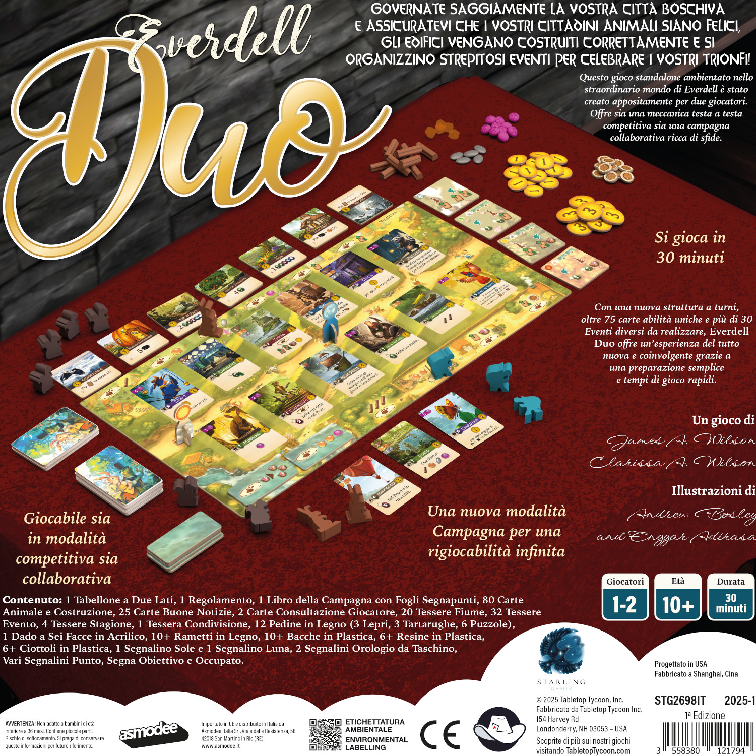 Everdell Duo è la versione standalone pensata per due giocatori del celebre Everdell. Ambientato nello straordinario mondo della città boschiva, il gioco mantiene la grafica e le meccaniche originali, introducendo però nuove modalità e innovazioni. I giocatori dovranno schierare i propri lavoratori animaletti per raccogliere risorse, costruire edifici e giocare carte, con l’obiettivo di sviluppare la propria città e ottenere il maggior numero di punti. La partita si articola in 4 stagioni, con un sistema di avanzamento tramite i segnalini sole e luna che scandisce la fine dei round.