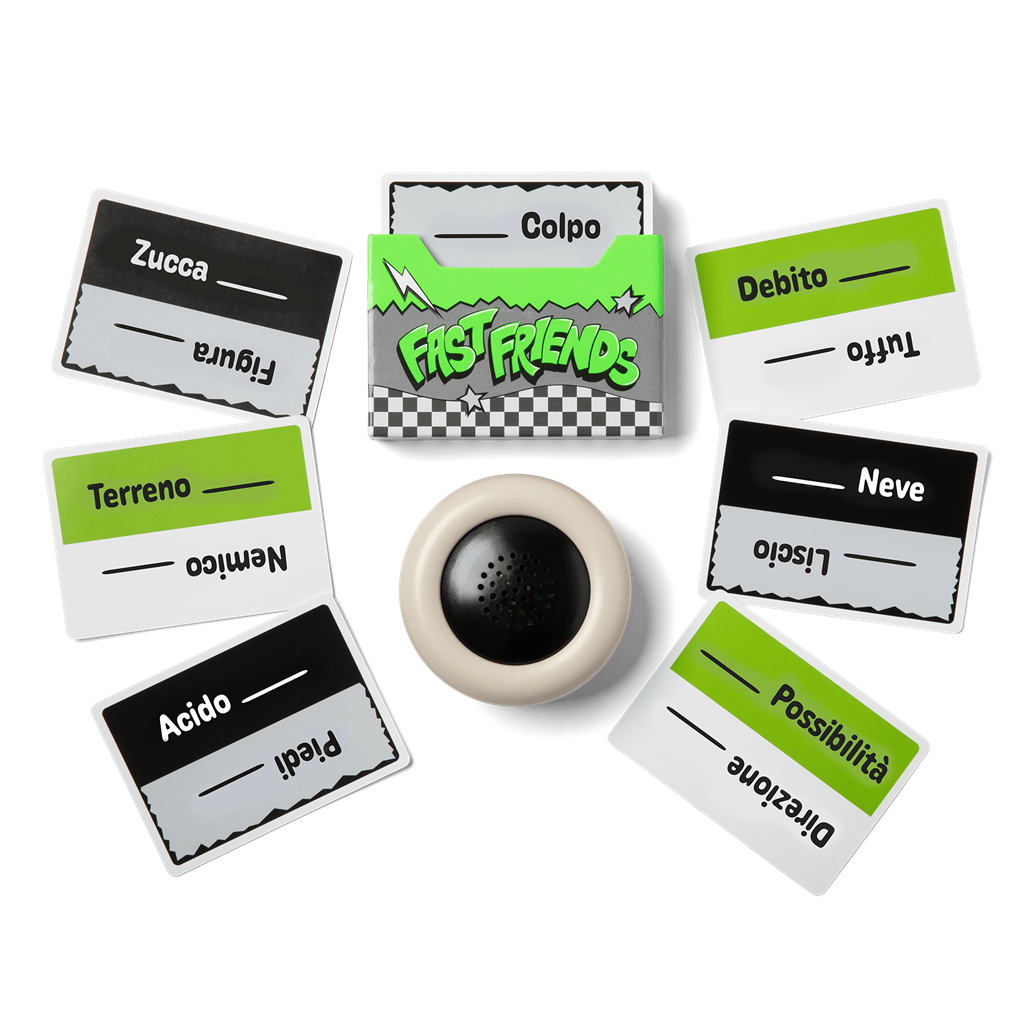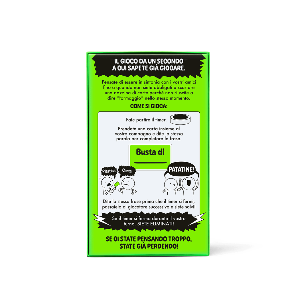 Esempio: la carta mostra “Busta di ____”. Alcuni penseranno “plastica”, altri “carta”, ma solo chi dice “patatine” insieme al compagno si salva. Più ci pensate, più rischiate di perdere: la velocità è tutto.