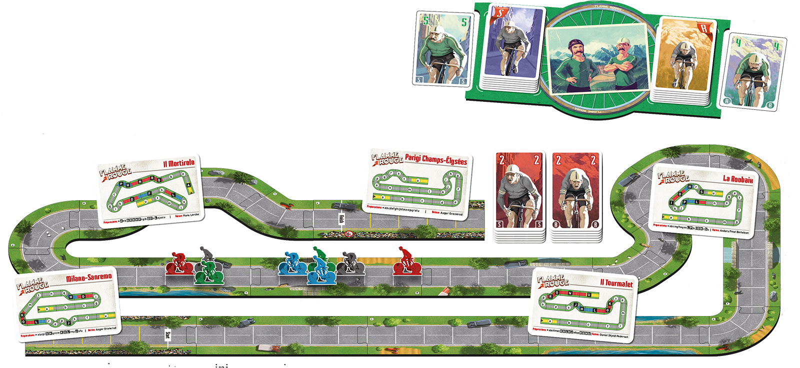 4 plance giocatore, 8 miniature dei ciclisti, 21 tessere percorso, 190 carte, 1 regolamento.