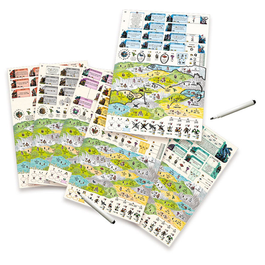 6 plance Giocatore 4 schede riassuntive 4 pennarelli 1 regolamento