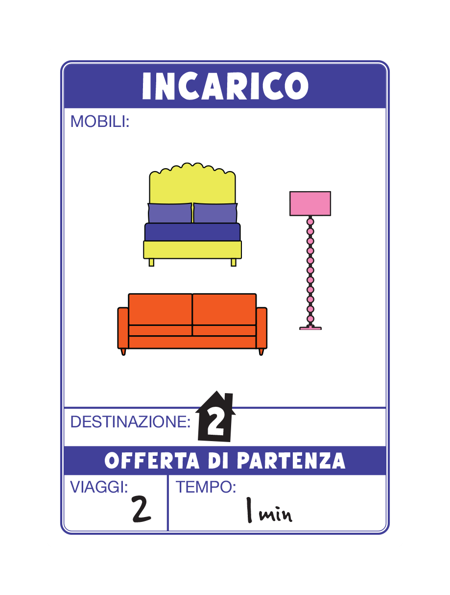 Contenuto: 10 mobili da assemblare, 1 recinzione da assemblare, 1 guida per l’assemblaggio, 21 carte incarico, 3 indicatori nuova casa.