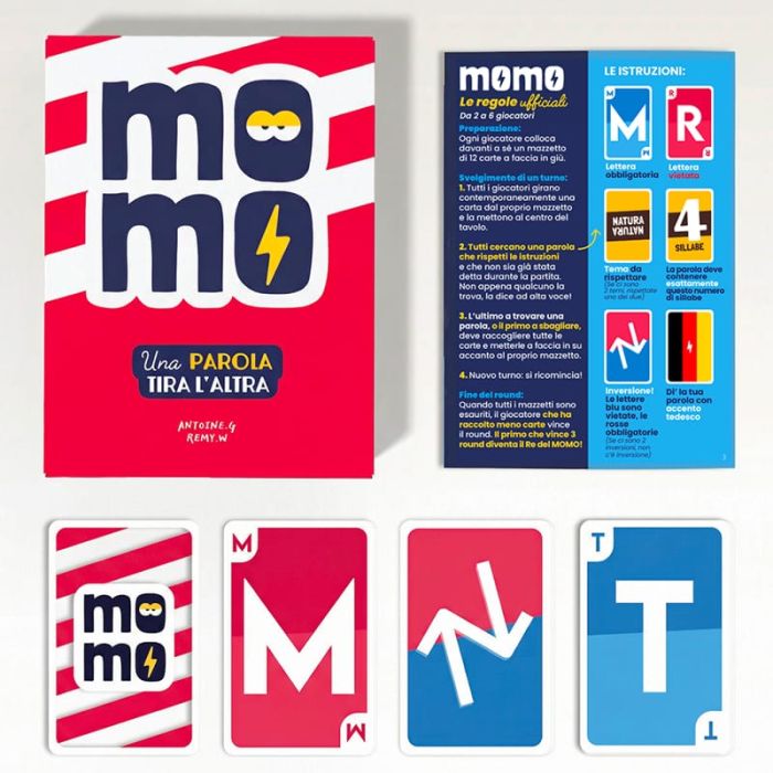 MOMO è un gioco di carte rapido e coinvolgente che mette alla prova riflessi, concentrazione e sangue freddo. A ogni turno i giocatori devono pronunciare una parola che includa tutte le lettere blu evitando quelle rosse, una sfida che sembra semplice ma che diventa sempre più insidiosa man mano che le combinazioni cambiano.
