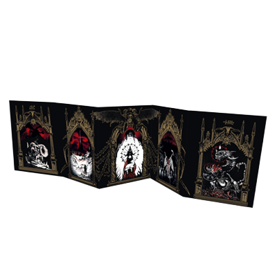 Il Schermo del GM di MÖRK BORG è un accessorio indispensabile per ogni sessione di gioco. Composto da cinque pannelli rigidi, si distingue per la stampa con inchiostro metallico dorato su un lato e un intenso giallo neon sull’altro. La parte frontale è arricchita da illustrazioni evocative di luoghi e personaggi del mondo morente di MÖRK BORG, mentre il lato rivolto al Game Master offre una selezione completa di tabelle di riferimento e sinossi delle regole, utili per velocizzare e rendere più fluida la partita.