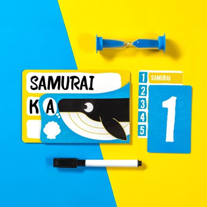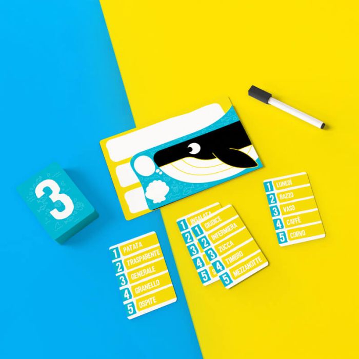 A turno, un giocatore interpreta la Balena e scrive segretamente una catena di tre parole collegate tra loro: la prima è visibile, le altre due solo in parte. Gli altri devono indovinare l’ultima parola partendo dalla prima, ricevendo come indizi una lettera alla volta. Per fare punti, la Balena deve creare associazioni logiche ma non troppo ovvie, così da mantenere la sfida avvincente. Le regole si imparano in un minuto, ma le combinazioni possibili sono praticamente infinite, rendendo ogni round diverso dal precedente.