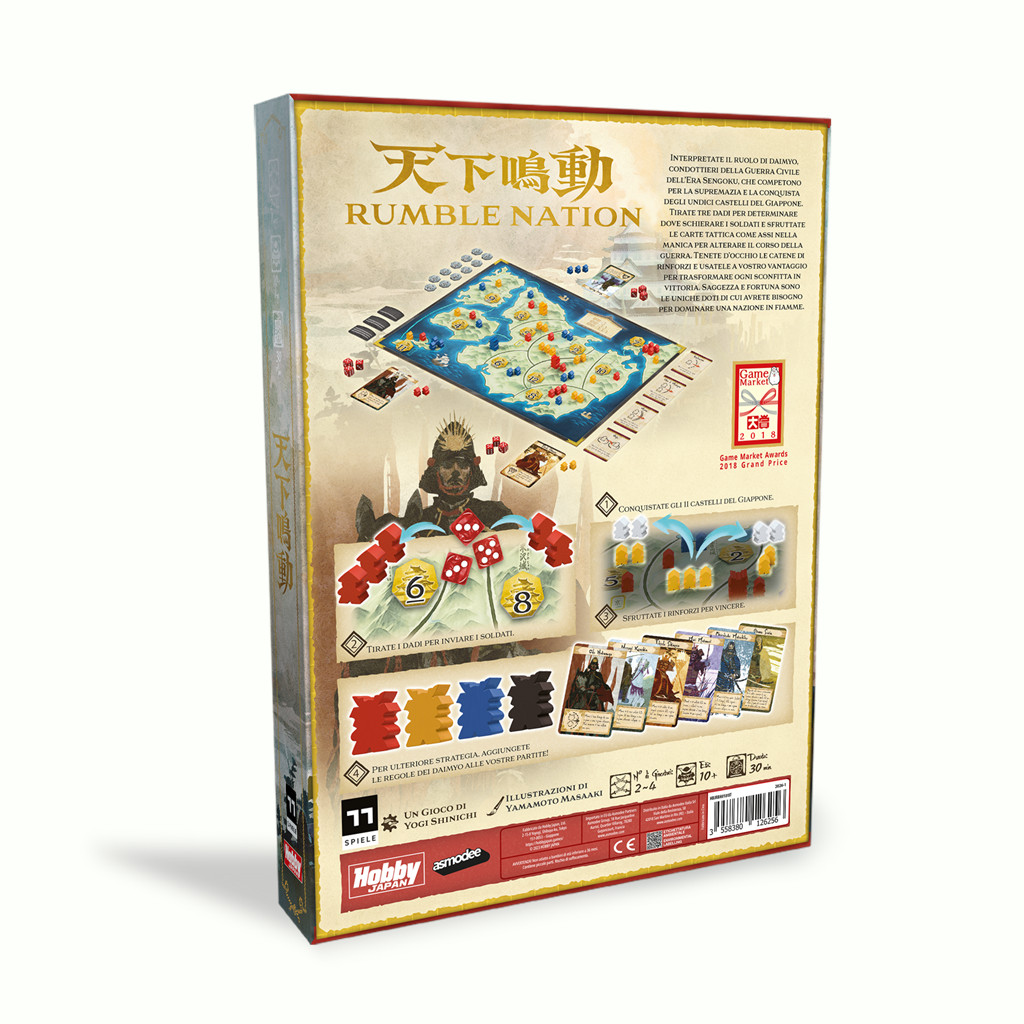 In questo gioco strategico ambientato nell’Era Sengoku, i giocatori interpretano il ruolo di daimyo impegnati nella conquista degli undici castelli del Giappone. Ogni turno richiede decisioni rapide e ponderate: il lancio di tre dadi determina dove schierare le truppe, mentre le carte tattica permettono di ribaltare il corso della guerra con mosse imprevedibili.