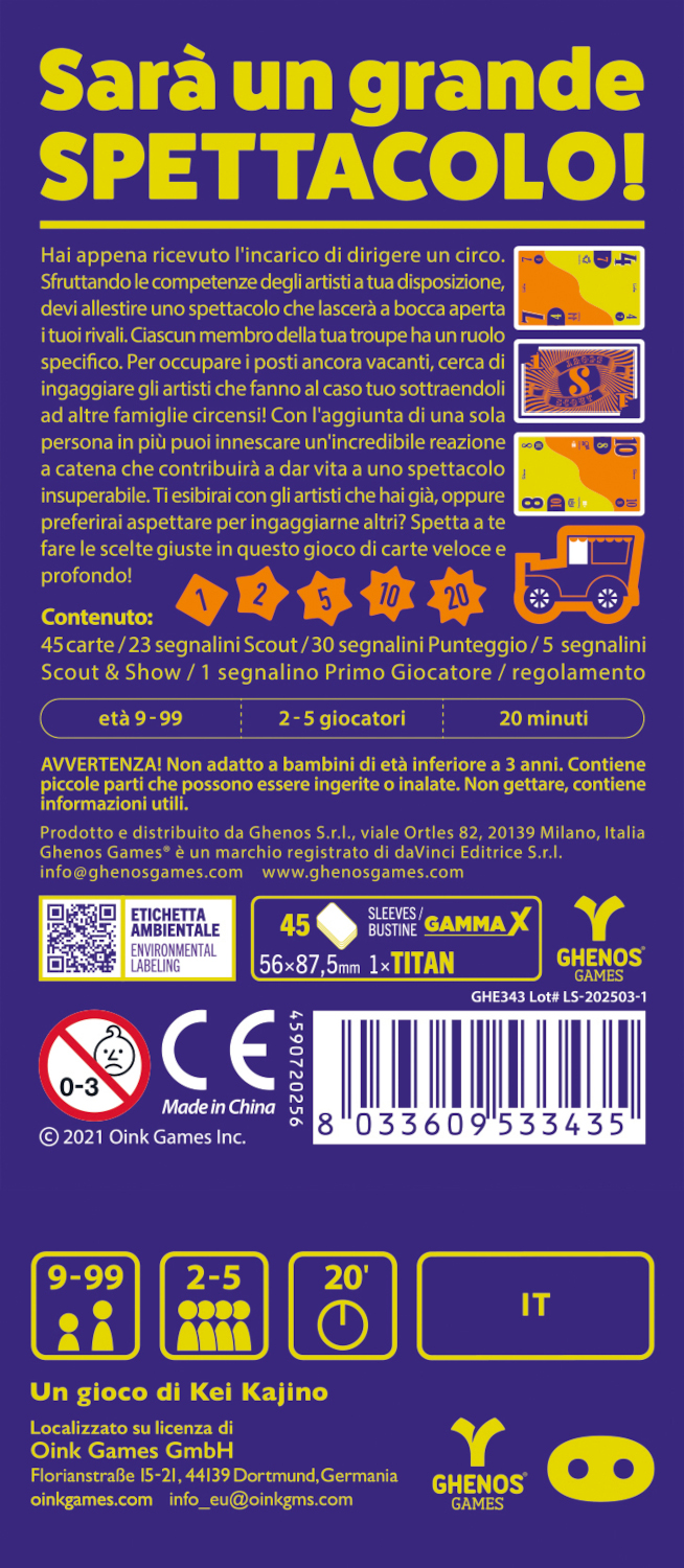 45 carte, 23 segnalini Scout, 30 segnalini Punteggio, 5 segnalini Scout & Show, 1 segnalino Primo Giocatore.